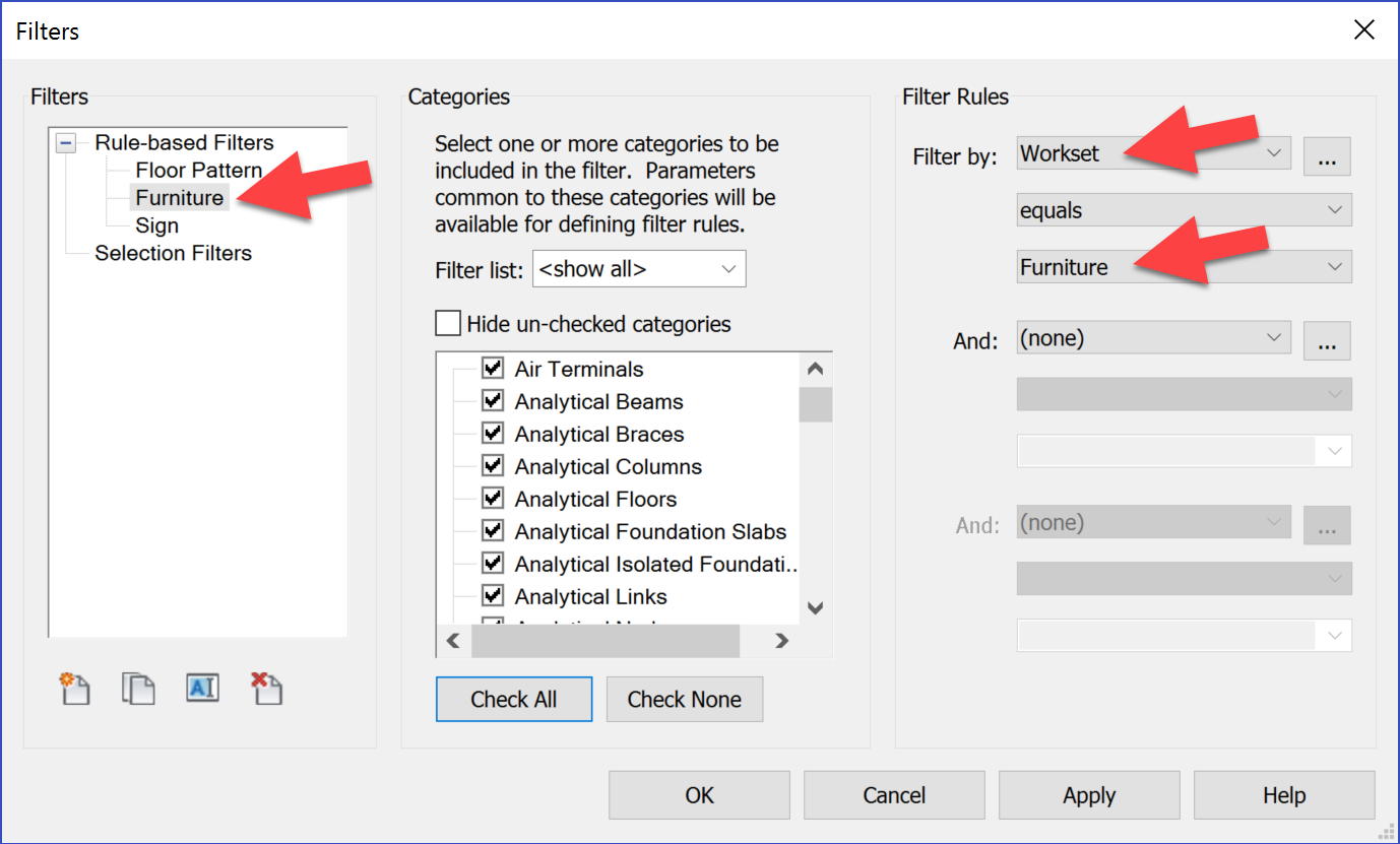Filters can also be used to control the visibility of worksets as seen in the next two images.