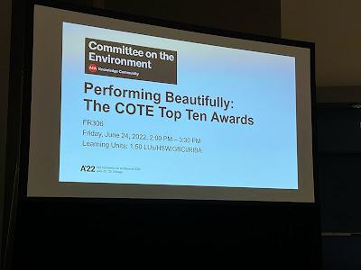 Another COTE session I attended (but was not involved in) was titled Performing Beautifully: The COTE Top Ten Awards. Led by one of this year's jurors, Margaret Cavenagh, AIA, Studio Gang, gave a brief overview of each winning project. Then, each firm member had a few minutes to talk about their project.